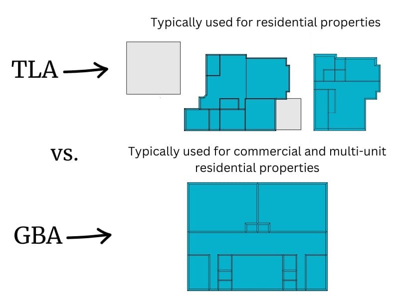 TLA is focused on the total living space on a property. In contrast, GBA typically measures the entire building area, including areas unsuitable for living in, such as atriums, mechanical rooms, and elevator shafts in commercial buildings or shared interior stairways in multi-family residential buildings. GBA is also usually calculated and reported for a single building and does not include adjacent buildings.